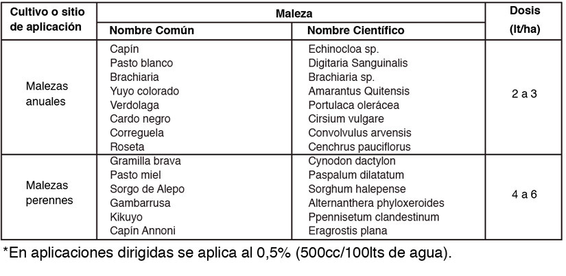 DESCRIPCIÓN DEL PRODUCTO : Herbicida sistémico no selectivo de pos emergencia. Actúa contra una gran variedad de malezas anuales y perennes. Se absorbe por el follaje y trasloca a las raíces, rizomas y órganos subterráneos provocando la muerte de la maleza. Luego de la aplicación se inactiva en contacto con el suelo por adsorción y transformación a través de los microorganismos y materia orgánica del suelo, por lo que no tiene efecto residual. Aplicar cuando las malezas estén en activo crecimiento.